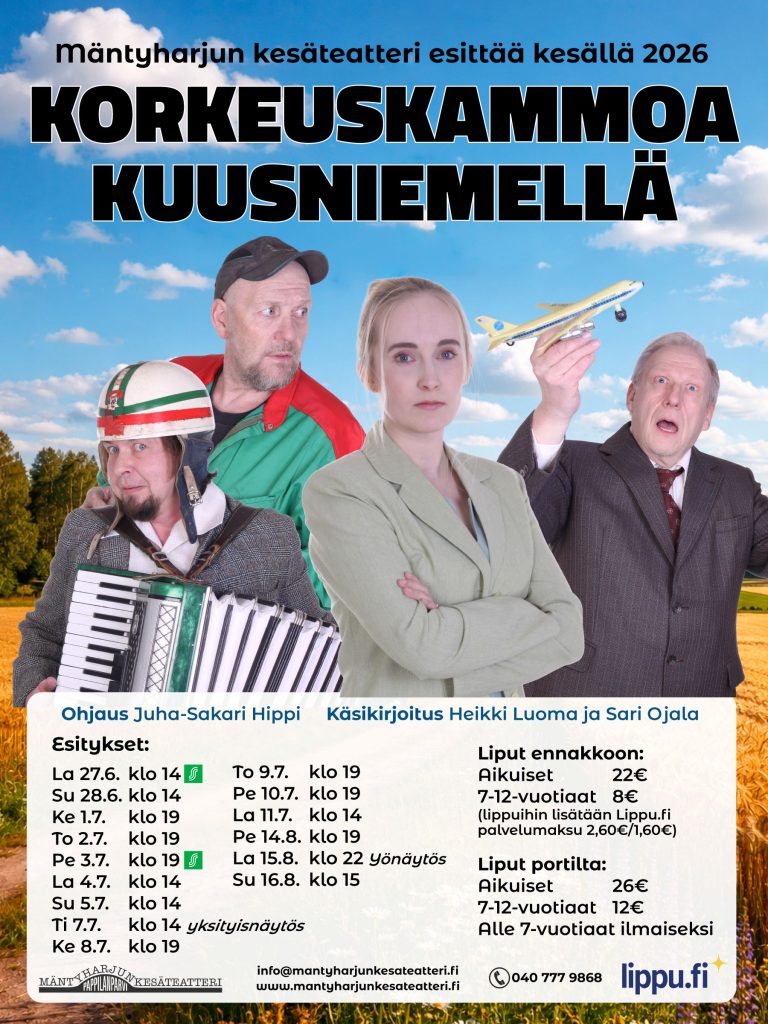 Heikki Luoman ja Sari Ojalan kirjoittama Korkeuskammoa Kuusniemellä on itsenäinen jatko-osa Tv:stä tutulle maalaiskomedialle. Tule katsomaan kun oman kylän upeat näyttelijät repivät itsestään irti sellaista heittäytymistä, että katsojat haukkovat henkeään, minkä huutonaurultaan pystyvät. Älä jätä tätä tapausta kokematta. Pappilanparven upea katettu katsomo ottaa teidät vastaan avosylin ja lisää Mäntyharjun vetovoimaan jälleen yhden upean jalokiven, joka on hioutunut loistoonsa ja asetettu helposti, nautinnollisesti ja vieläpä edullisesti nähtäville aivan keskustan tuntumaan.